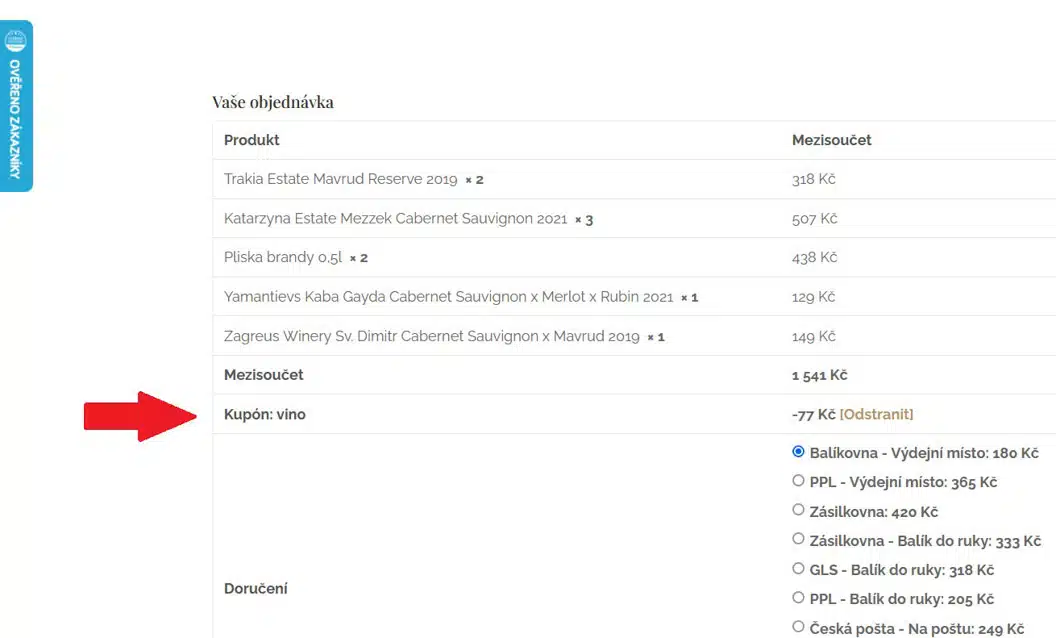 – obrázek pro lepší orientaci. - Pokračujte v procesu objednávky a potvrďte svůj nákup. Po zadání vašich adresních údajů si všimtete, že se vám odečetla částka 100Kč.
