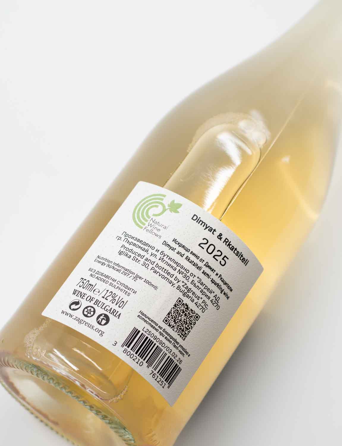 Spojení bulharské odrůdy Dimyat a gruzínské Rkatsiteli vytváří svěží, živé víno s jemným perlením, lehkou zakaleností a autentickou chutí hroznů.